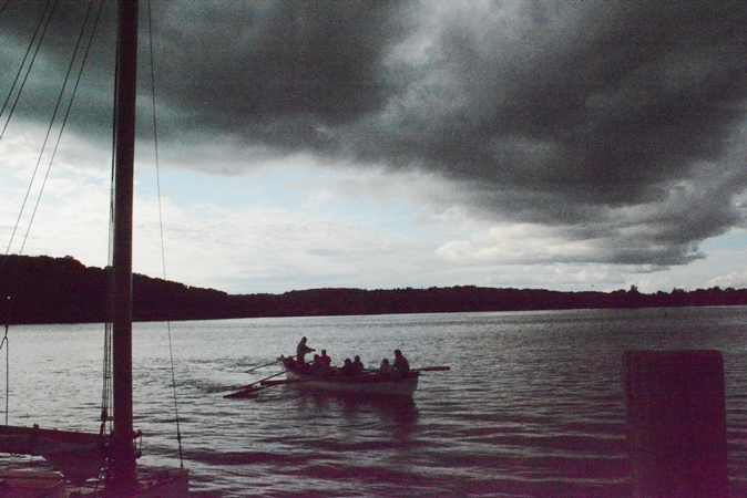In conjunction with the Morgan restoration, the seaport has ten reproduction whaleboats, which accompanied her on her summer voyage. During some of her port calls, visitors had the opportunity to take to the oars and go for short trips around various harbors. A series of chance conversations brought about a similar opportunity for us after the seaport closed for the day. Jim Mortimer, Liz Kading, and their crew from the seaport staff met us at the whaleboat dock and headed boats out for us to take our turns at the oars.