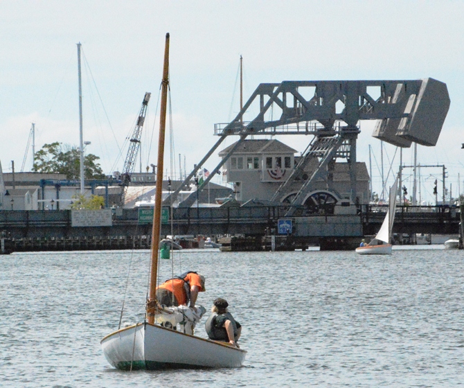 The course itself was a different story entirely. The starting line was marked by the committee boat (headed by seaport staffer Chris Williams) and a temporary buoy, and the windward mark was one of the can buoys that marks the shipping channel. Here’s where it gets tricky: our gorgeous Saturday in high summer meant there was plenty of boat traffic on the river, including one big motor boat that seemed intent on having a very close view of the pretty sailboats, especially as they were trying to maneuver around the windward mark. The wind and tide were both headed downstream, and catboats–despite their many virtues–don’t point terribly high on the wind, so sailing to windward requires a lot of tacking. It’s a river, which means it has a current, and this one is narrow with one side substantially shallower than the other. … all of which meant going down river was easy, but getting back was a beast! |